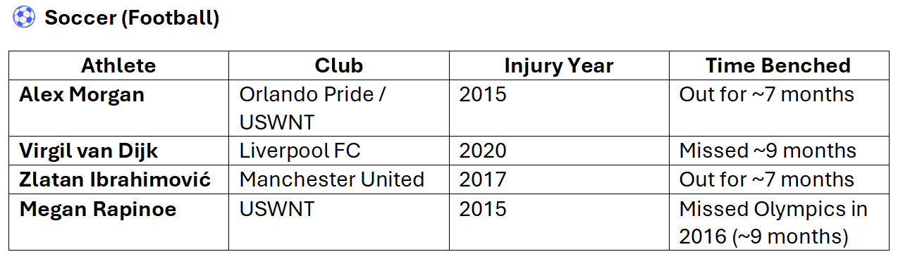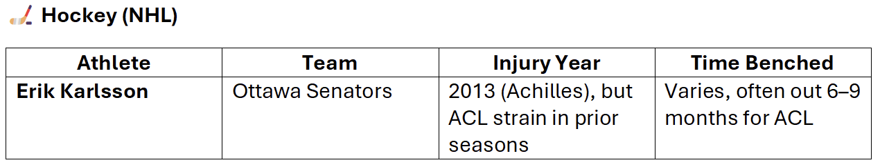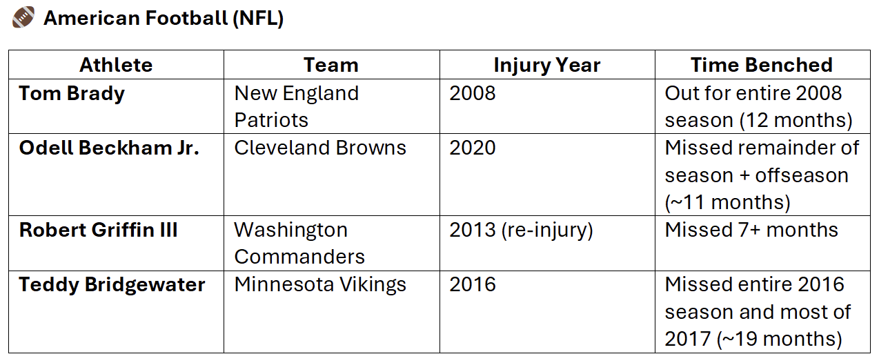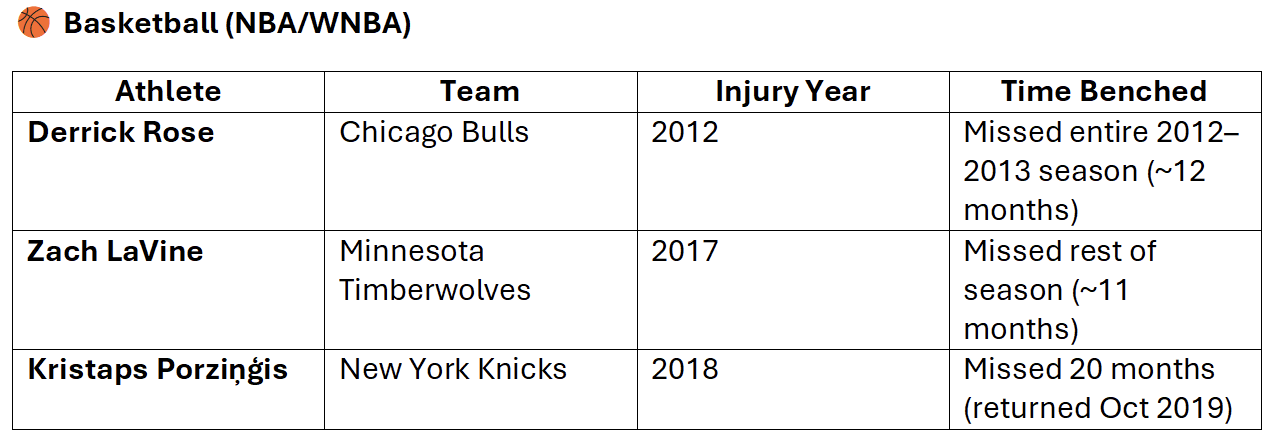 The following tables showcase some of the most notable athletes sidelined by ACL tears, when the injury occurred, and how long it took them to return to competition—providing a clearer picture of the impact ACL injuries can have on even the most resilient players.