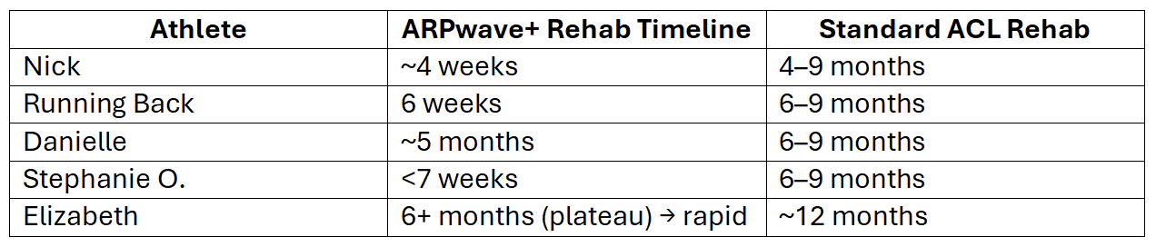 By utilizing targeted electrical stimulation to promote faster muscle reactivation and improve joint function, ARPwave offers significant advantages over traditional rehabilitation methods. The following case studies explore the key benefits of ARPwave for ACL recovery—highlighting how it can accelerate healing, reduce downtime, and help athletes return to their peak performance levels faster and safer than ever before.