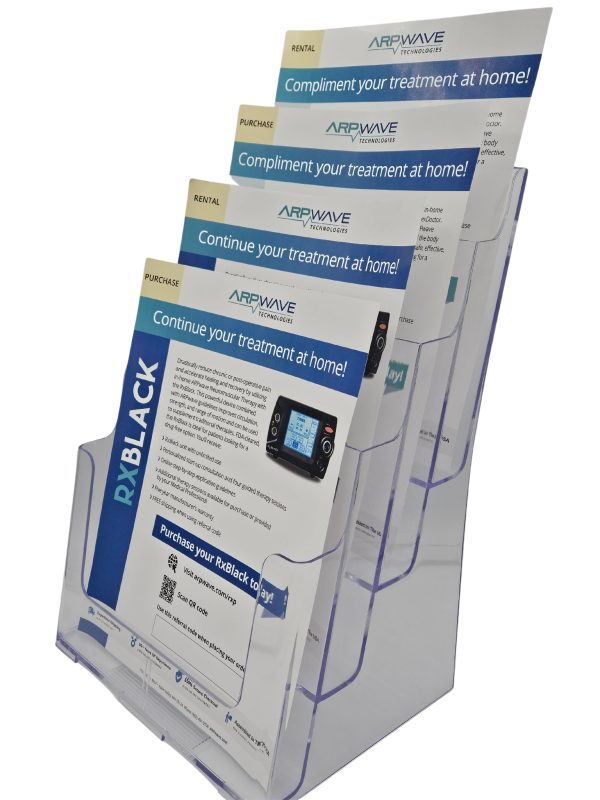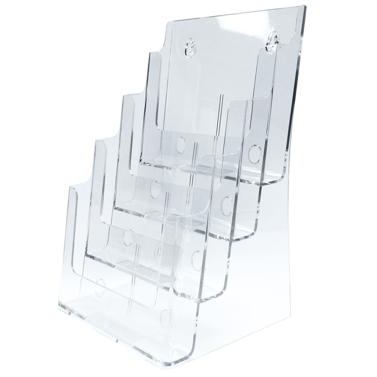 This 4-tiered plastic brochure holder is free-standing and can be wall mounted as well. The four literature pockets are constructed for magazines or catalogs measuring at 8 1/2″w x 11″h. Each pocket is 5-1/2″ high by 1-1/8″ deep. The back pocket sits 2-1/4″ above the front pocket to allow each title to be read. Overall dimensions of holder are 6-3/4″ deep and 13-3/8″ high. These holders have two “key slot” holes in back for optional wall hanging with a conveniently display of 8-1/2″ wide magazines on countertops.